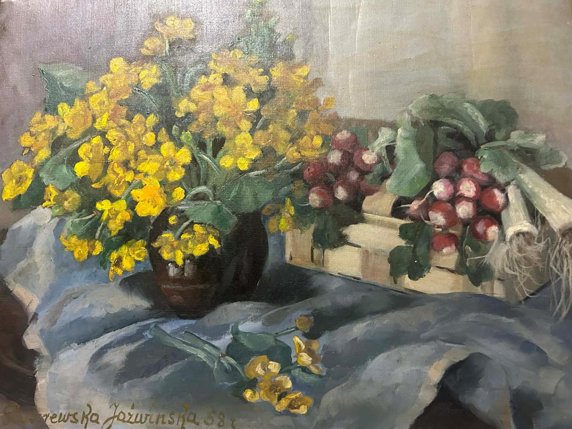 Zofia Paderewska-Jaźwińska (1902-1969) "Martwa natura z kaczeńcami i rzodkiewką", źródło: Antique Arena